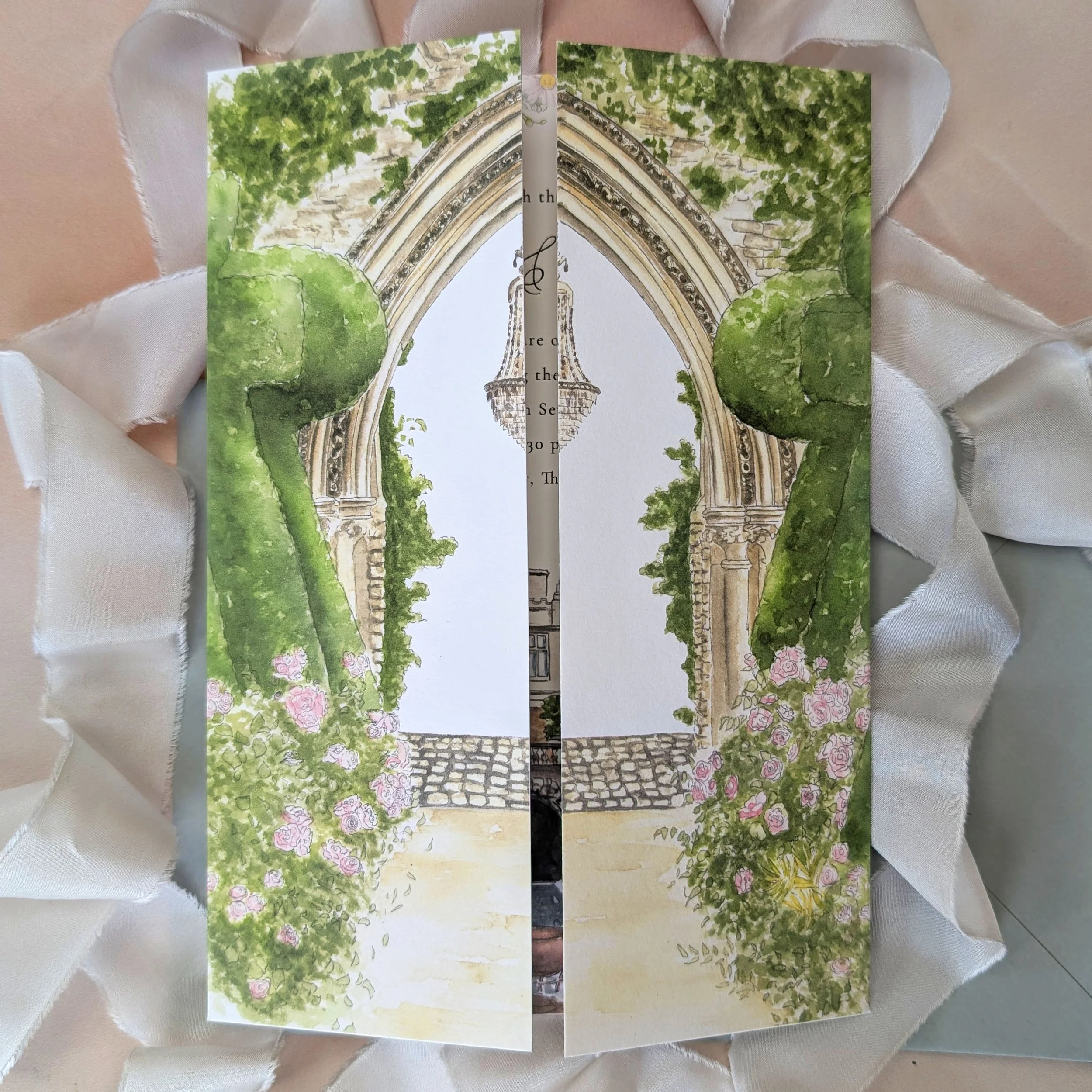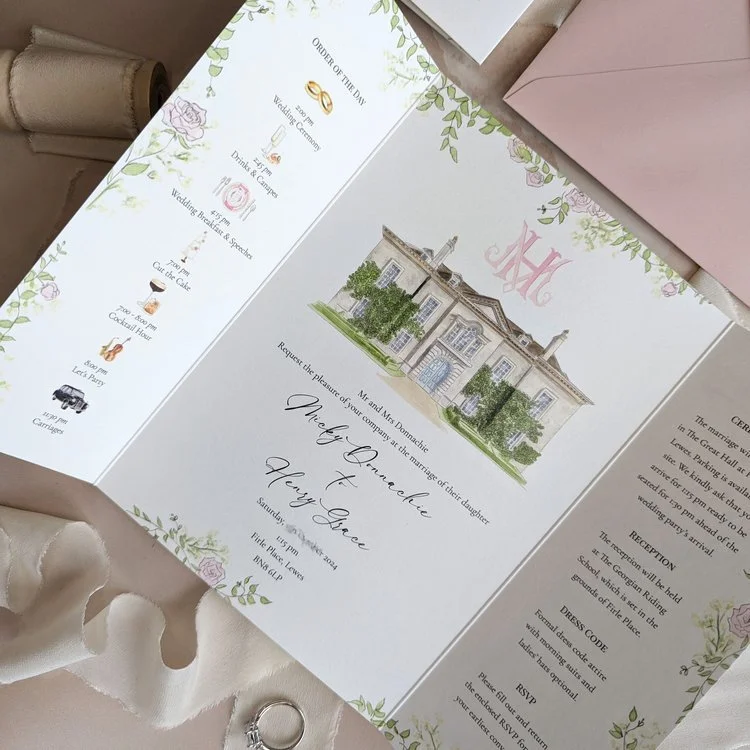 This illustrated gatefold is a more structured alternative to my fully bespoke invitation suites.