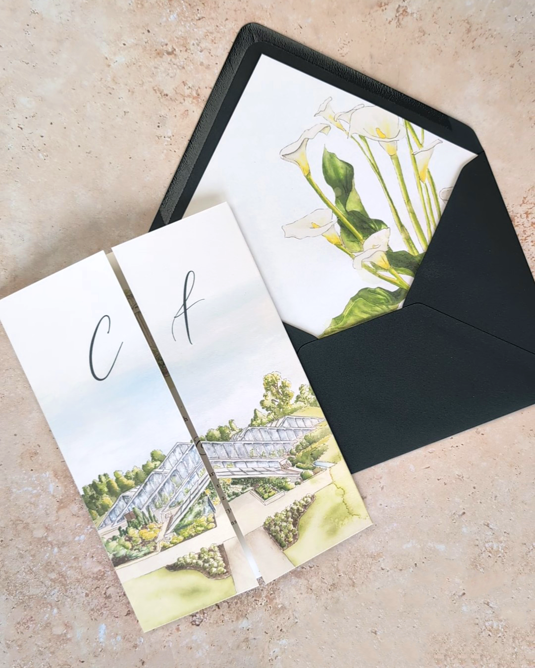 This illustrated gatefold invitation is designed for couples who want something deeply personal and beautifully crafted, without the full scope of a completely bespoke suite.