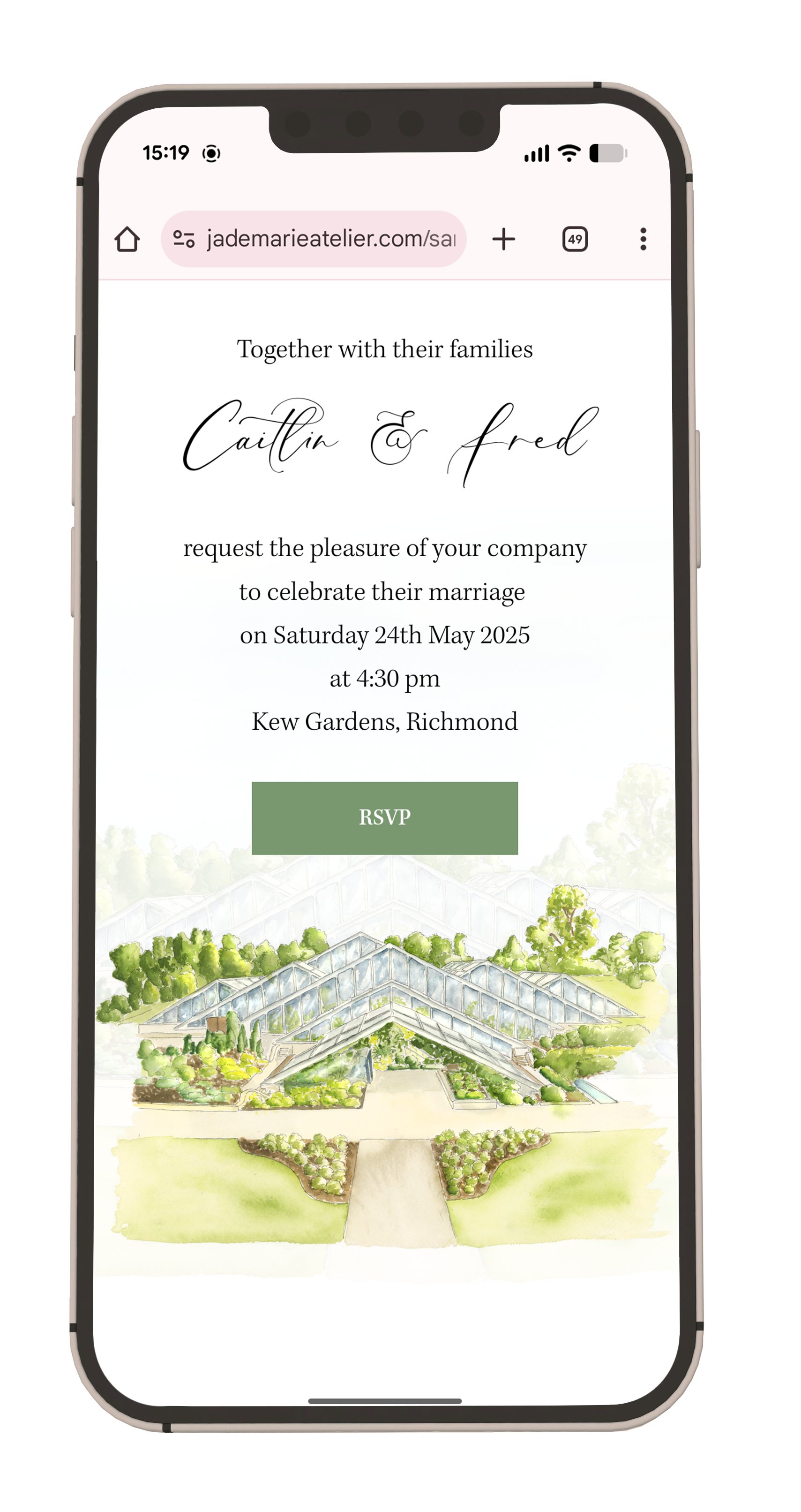 There is no visible Jade Marie Atelier branding on your website. The only place the main site appears is within the browser URL, and if you’d prefer, a custom domain can be purchased so your website link can be printed cleanly on your invitations.